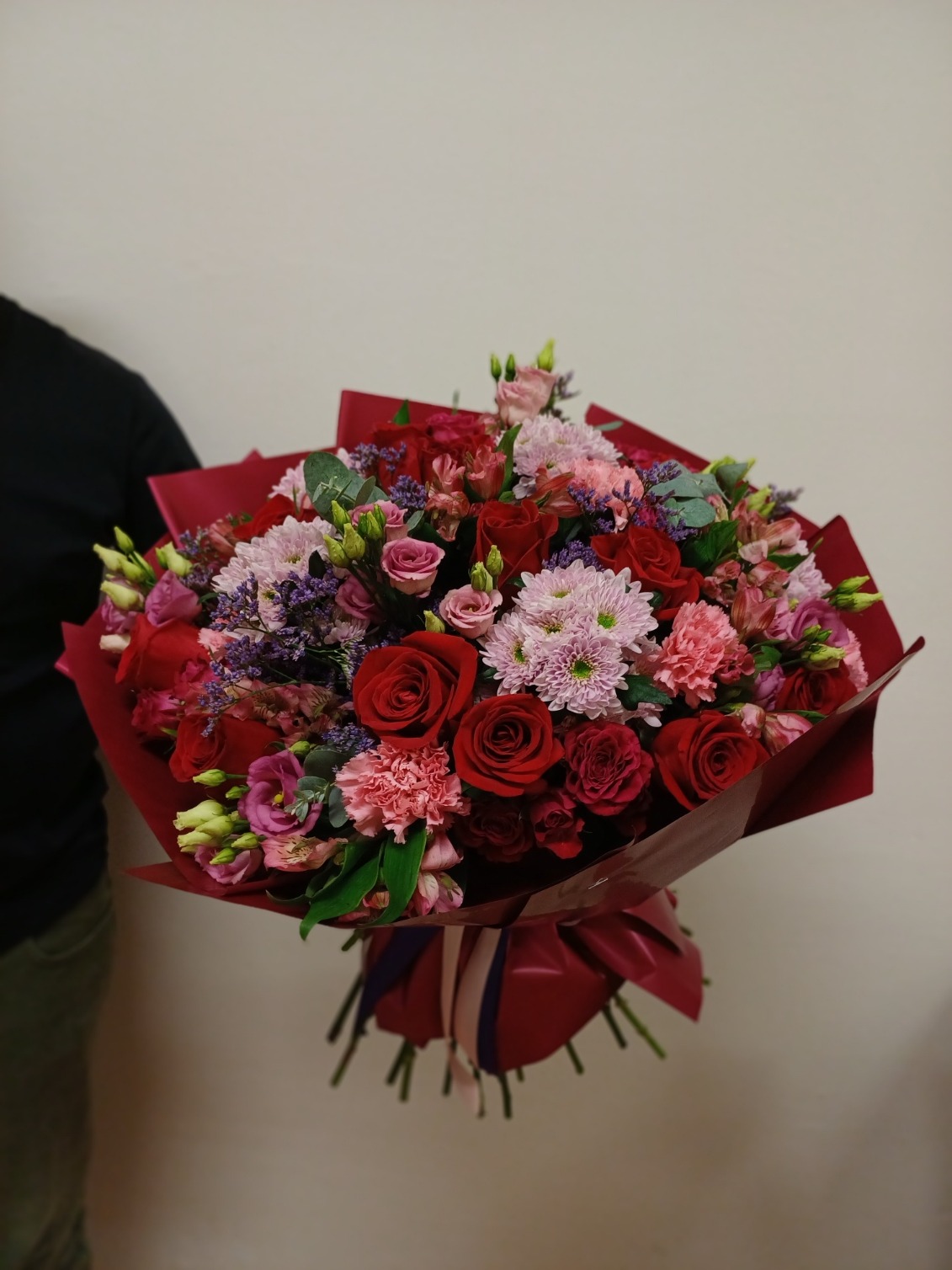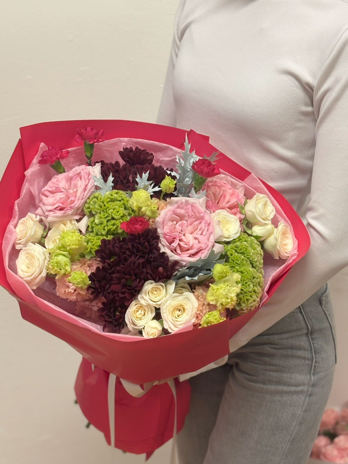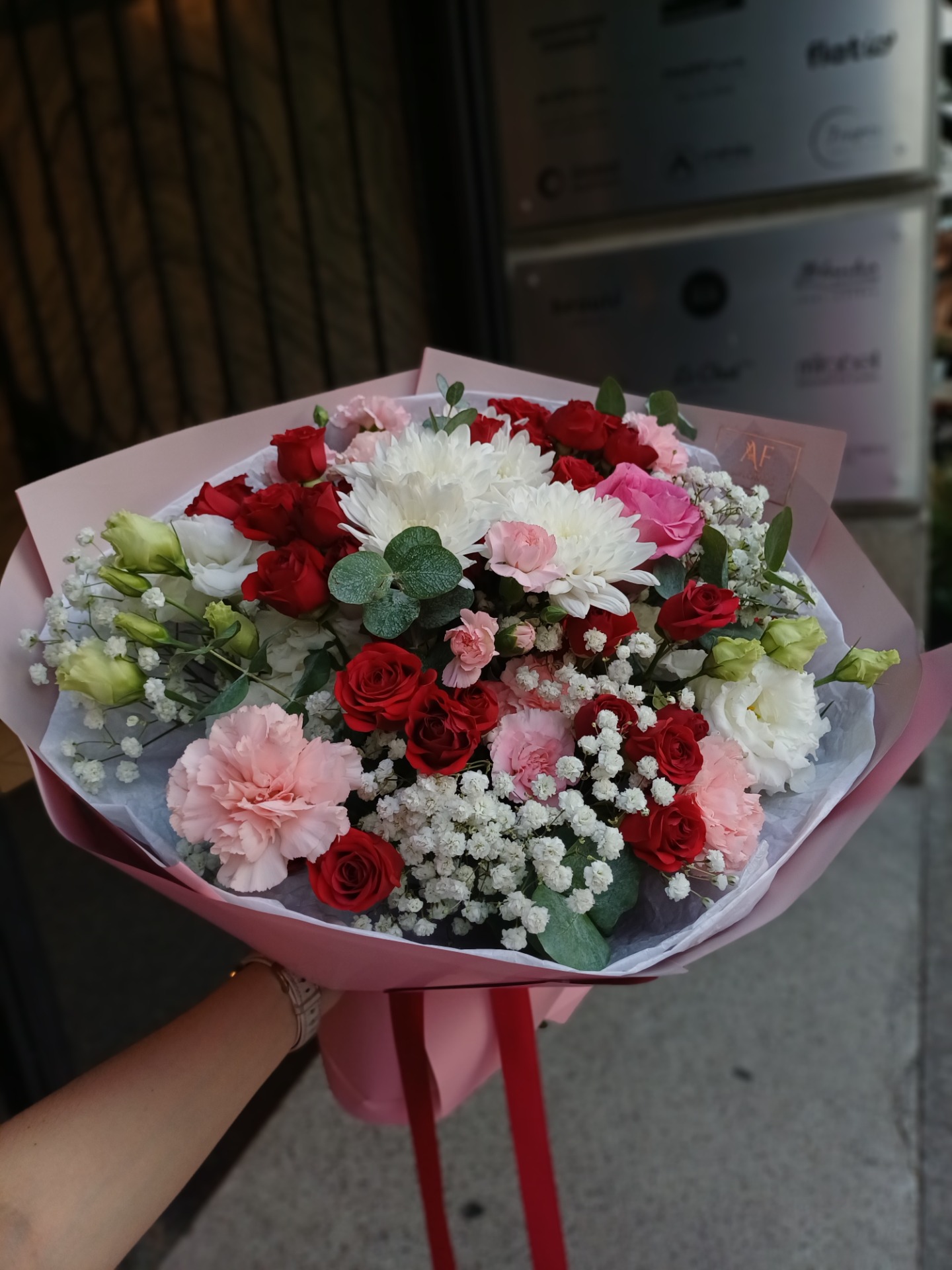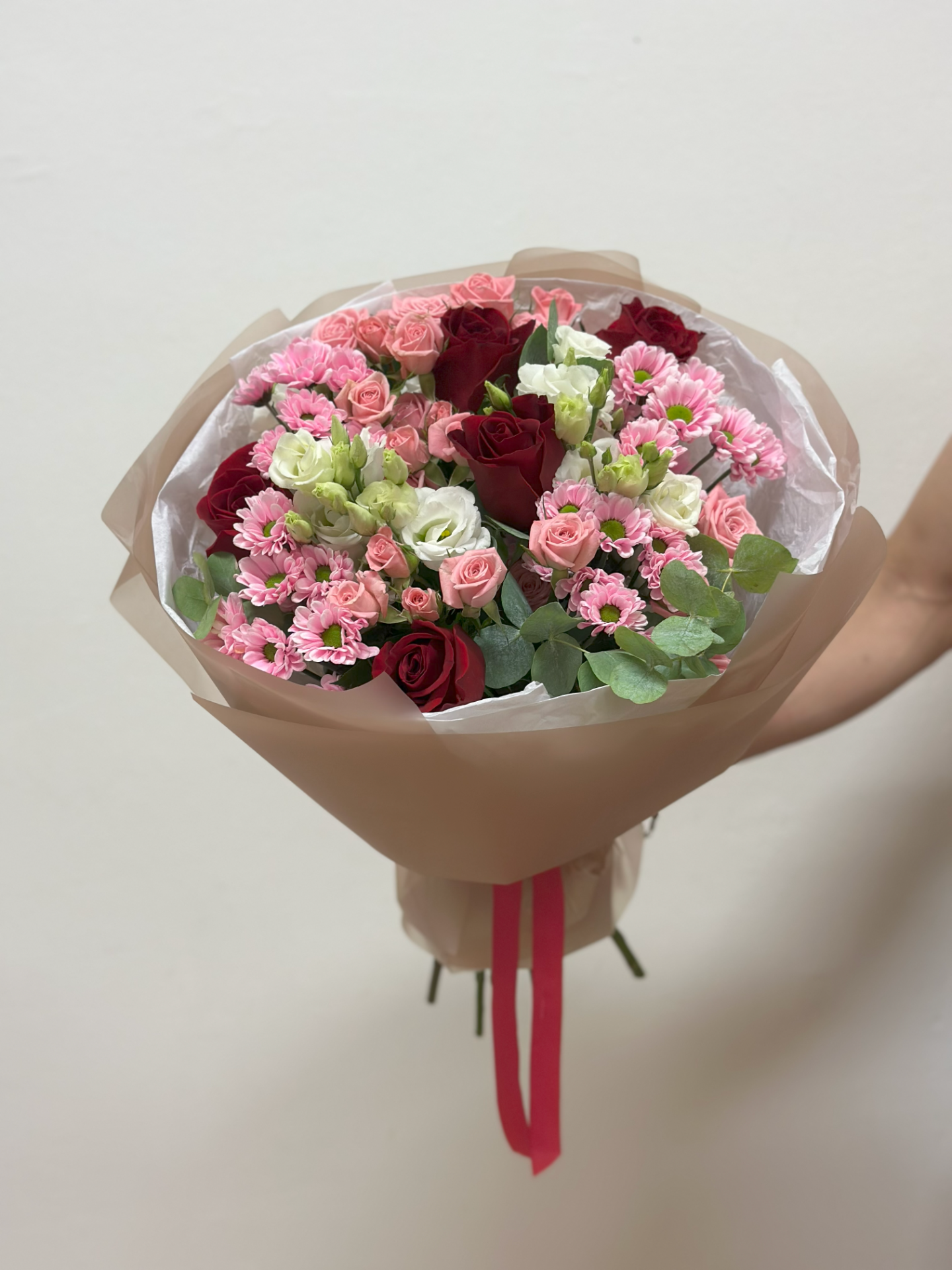 Kombinace růžové a červené symbolizuje lásku, vášeň a něhu. Tato výrazná a romantická kytice je ideální volbou pro zvláštní příležitosti, jako jsou výročí, narozeniny nebo jako projev hlubokých citů. Květiny jsou pečlivě vybrané a doplněné o svěží zeleň pro dokonalý harmonický vzhled.