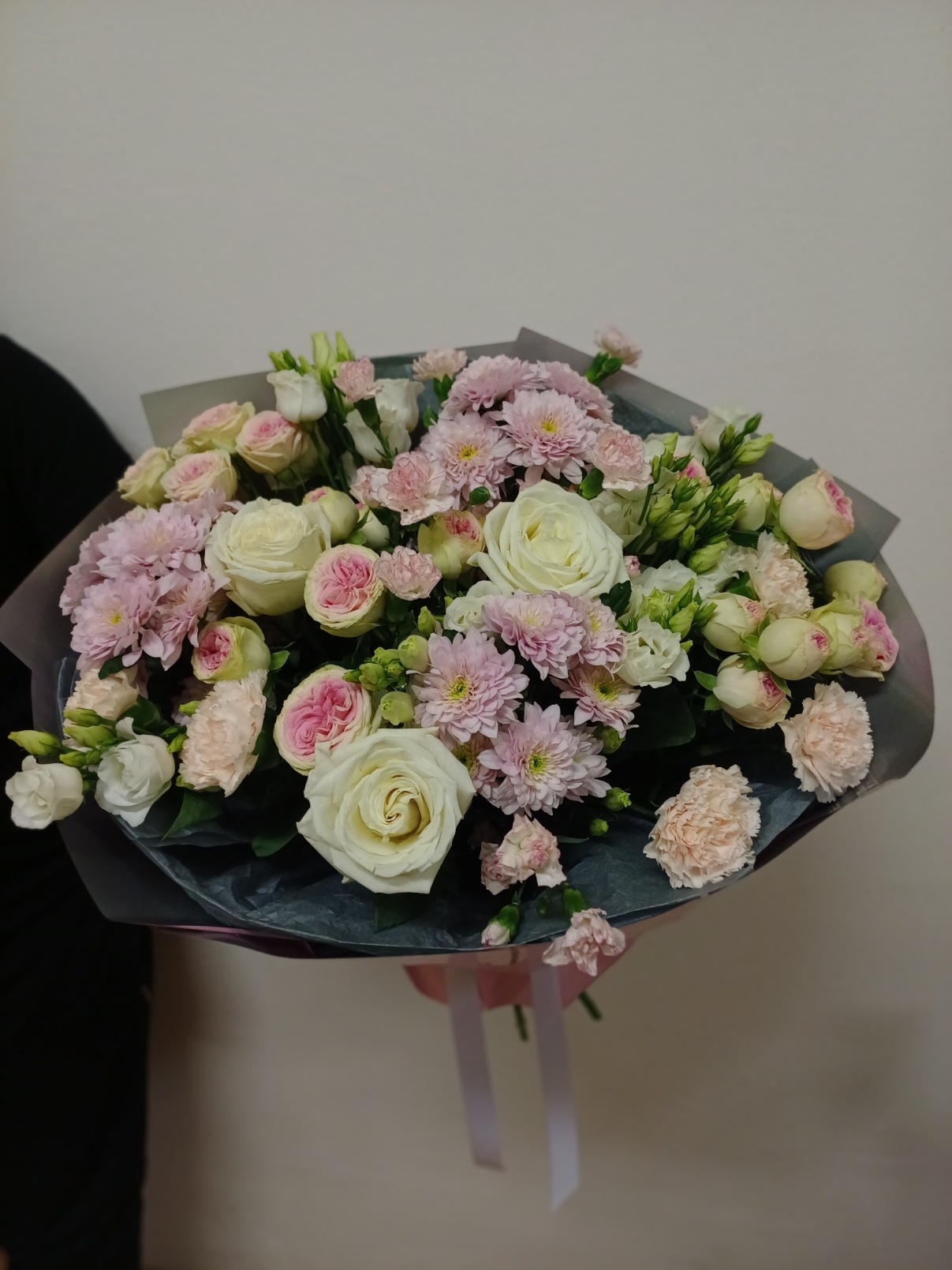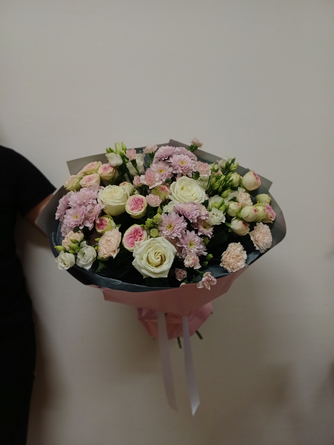 Готовий букет, зібраний у єдиному екземплярі зі свіжих квітів. Доступний для доставки або самовивозу вже сьогодні. Ви отримаєте саме той букет, який бачите на фото.
