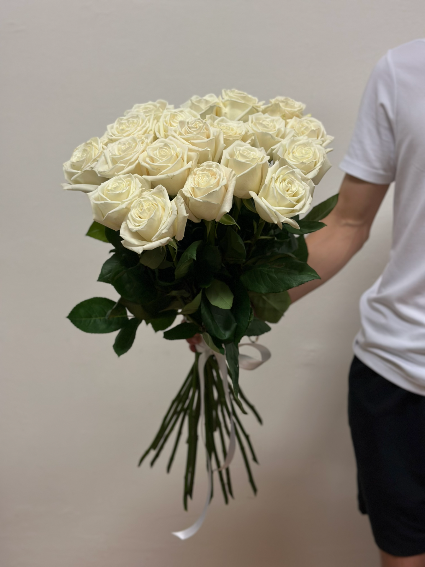 Bílé růže symbolizují čistotu, eleganci a upřímnost. Tato jemná a nadčasová kytice je ideální volbou pro svatební dar, vyjádření úcty nebo jako elegantní překvapení pro vaše blízké. Pečlivě uvázaná přináší pocit harmonie a krásy.